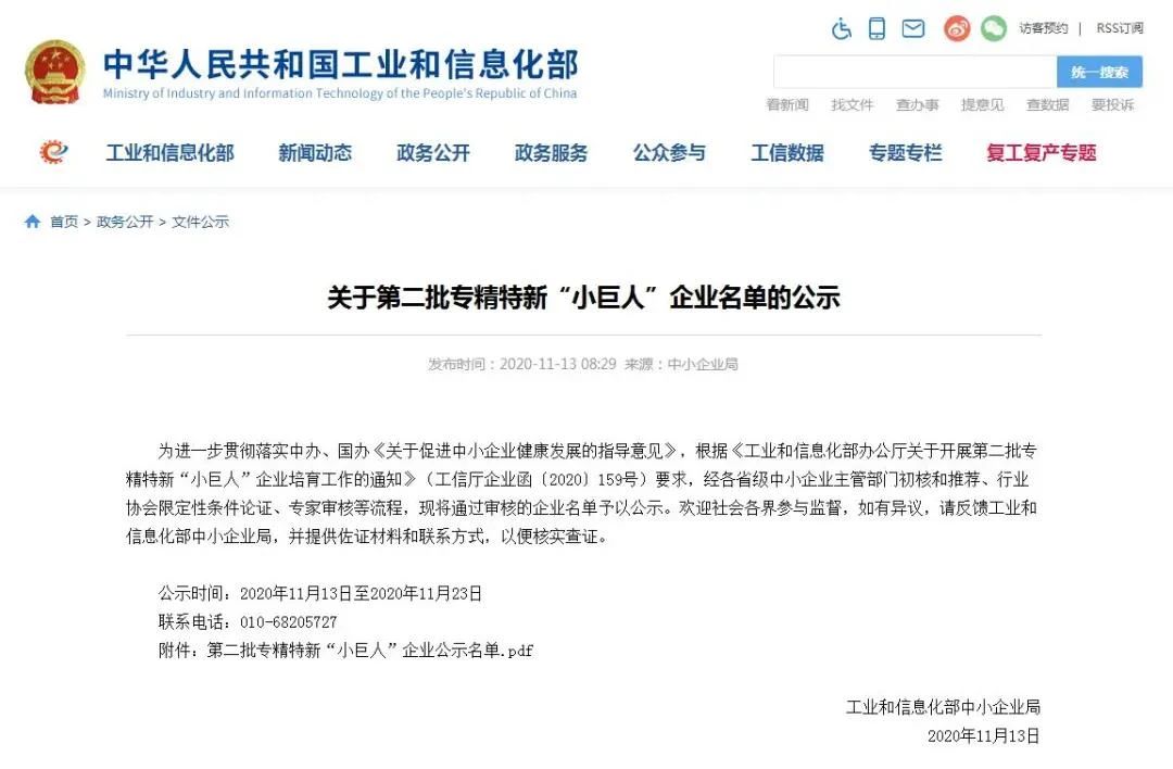 此次專精特新“小巨人”企業(yè)的評選是根據(jù)《工業(yè)和信息化部辦公廳關于開展第二批專精特新“小巨人”企業(yè)培育工作的通知》(工信廳企業(yè)函〔2020〕159號)要求,經(jīng)各省級中小企業(yè)主管部門初核和推薦、行業(yè)協(xié)會限定性條件論證、專家審核等流程,歷時4個月的時間,最終由工業(yè)和信息化部認定了一批創(chuàng)新能力強、專業(yè)化發(fā)展明顯、管理水平先進、轉(zhuǎn)型升級突出、市場占有率高、質(zhì)量效益較好的專精特新“小巨人”企業(yè)。