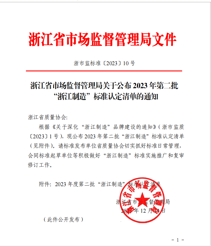 日前,浙江省市場監(jiān)督管理局公布2023年第二批“浙江制造”標準認定清單,